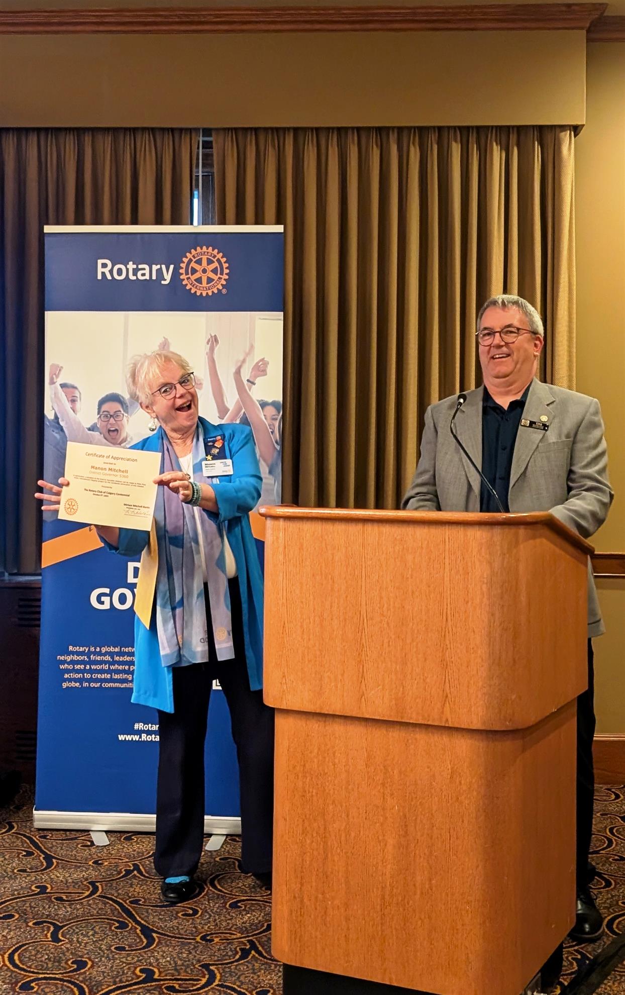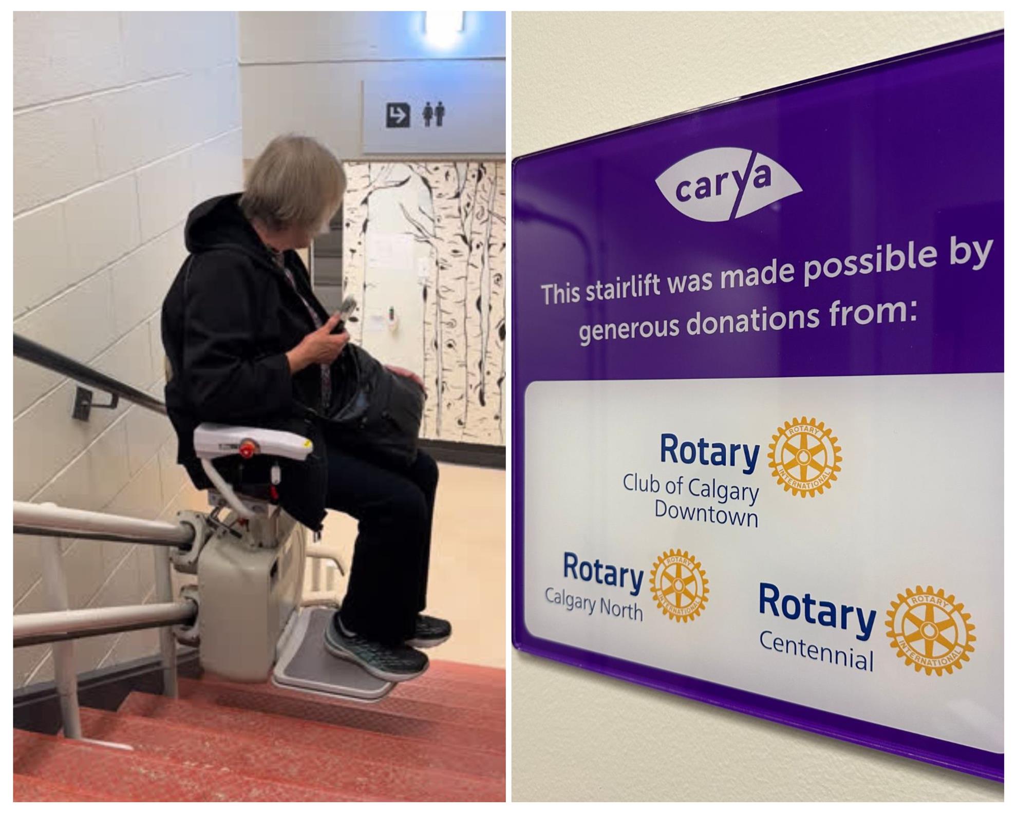 Carya provides programs for seniors and lower income families out of 2 locations, Bowmont and Village Commons. The Bowmont building is nearly 100 years old and has served in a number of capacities, Montgomery Town Hall, Police station and bank. The building has 2 conference rows, 1 on the main level and 1 in the basement. In order to make the basement conference room more accessible to seniors Carya applied to Rotary through Rotary Helps YYC to fund the purchase and installation of a Chairlift in late 2023. Rotary Clubs of Calgary Centennial, Calgary North and Calgary Downtown funded the Chairlift. The official opening was held October 17, 2025 at 1 pm, the opening was facilitated by Janice Nelson and Jocelyn, and attended by Richard Heslop and Irene Osteneck. Centennial member Irene took a test ride on the lift.